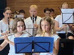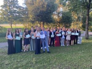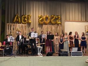 Die Abi-Bigband und ein kleiner Abi-Chor griffen mit „ I´m still standing“ den nachdenklichen Teil von Leonies Rede auf. Zwar hatte der Song viel Schwung und animierte alle zum Mitrocken, aber eigentlich lautete die Botschaft: Wir haben die Jahre überlebt. Die anschließende Preisverleihung dauerte etwas länger, denn es wurden 55 Preise vergeben. 22 waren Preise von außenhalb der Schule, acht Preise wurden von den Fachschaften des FAG gestiftet. Für besonders Engagement zum Wohle der Schule erhielt Ben Adam den FAG-Zimmermann-Preis. 25 Abiturienten erhielten einen NC-Preis für einen Abitur-Durchschnitt von 1,0 bis 1,9. Der Höhepunkt war die Vergabe der vier Preise für die Abiturschnitte mit 1,0 an Leonie Schulte, Rebecca Krüger, Lena Eppinger und Laura Wizgall. Diese Zahl ist schon an sich imponierend genug, aber fast unglaublich ist die Leistung von Leonie Schulte, die mit 898 von 900 Punkten eines der besten Abiture in Deutschland 2022 gemacht hat. Dafür wurde Leonie durch Herrn Flöter von der VR-Bank mit dem Abiturientenpreis der VR-Bank ausgezeichnet.
