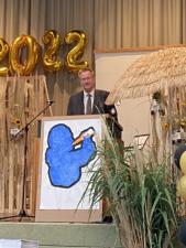 Herr Damp ist es wichtig, dass die Abiturientinnen nicht nur mathematische Begriffe mitnehmen, sondern auch Methoden- und Sozialkompetenzen, Spaß an der Teamarbeit und ein tiefes Verständnis von Demokratie. Richtig ernst wurde es dann bei dem Punkt Statistik: Die 78 Abiturientinnen und Abiturienten haben dieses Jahr im Abitur 46.745 Punkte gesammelt, das sind Durchschnitt 615 Punkte und ein Abiturschnitt von 2,2 in Noten - was nur geringfügig von dem letztjährigen Erfolgsschnitt abwich. Vier Schülerinnen haben einen Traumschnitt von 1,0 erreicht, so viele wie noch nie am FAG. Neben dem fachlichen Engagement haben sich die Schüler auch in der SMV, beim Theater und in den verschiedenen Musik-AGs engagiert und somit die Schule - trotz Pandemie - zu einem lebendigen Lernort gemacht. Für die Zukunft wünscht er den Schülern Mut zu politischem Engagement in unseren schwierigen Zeiten. Dem Abi-Motto „Coronabier – die Schule war häufiger dicht als wir“ stellte Herr Damp noch weitere Corona-Alternativen gegenüber: ABIontech: Endlich kommen wir auf den Markt oder Abi 2022 - Mehr Tests gemacht als geschrieben oder Abi 2022 - Die Noten sind besser als die Internetverbindung.