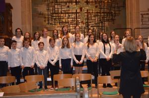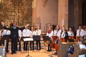 Geführt von der Orgel der Stadtkirche stimmte das Publikum das „Hark! The Herald Angels sing“ an, dessen drei Strophen gewaltig durch die Kirche hallten und anschließend vom Mittel- und Oberstufenorchester wieder aufgenommen wurden. Nach zwei weiteren Stücken von Felix Mendelssohn – „Praeludium in G“ und „Lied ohne Worte Op. 19 Nr. 4“ – erklang das beliebte englische Lied erneut, dieses Mal in einer reinen Instrumentalfassung. Benjamin Albrecht ließ sein Orchester dabei in einen Swing-Sound verfallen, der dem Weihnachtslied ganz neue Seiten abzugewinnen vermochte.